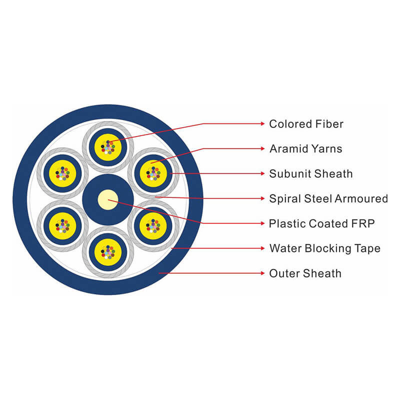 GJAFKV 실내 다중 코어 펀들형 장갑 광섬유 케이블은 다중 코어 펀들형 미니 ф250μm 광섬유 표면으로 강화된 다중 스트랜드 아라미드 섬유이다.PVC 또는 LSZH 내부 껍질의 층은 하위 단위로 스트랜드 표면에 엑스트루드됩니다., 하위 단위는 강철 철갑의 층으로 뭉쳐 있습니다. 하위 단위와 비 금속 강화 FRP (그리고 가능한 매트) 는 원으로 묶여 있습니다.중추와 껍질 사이에 건조한 방수 테이프로 포장, 그리고 마지막으로 PVC (또는 LSZH) 껍질은 엑스트루드 케이블입니다.